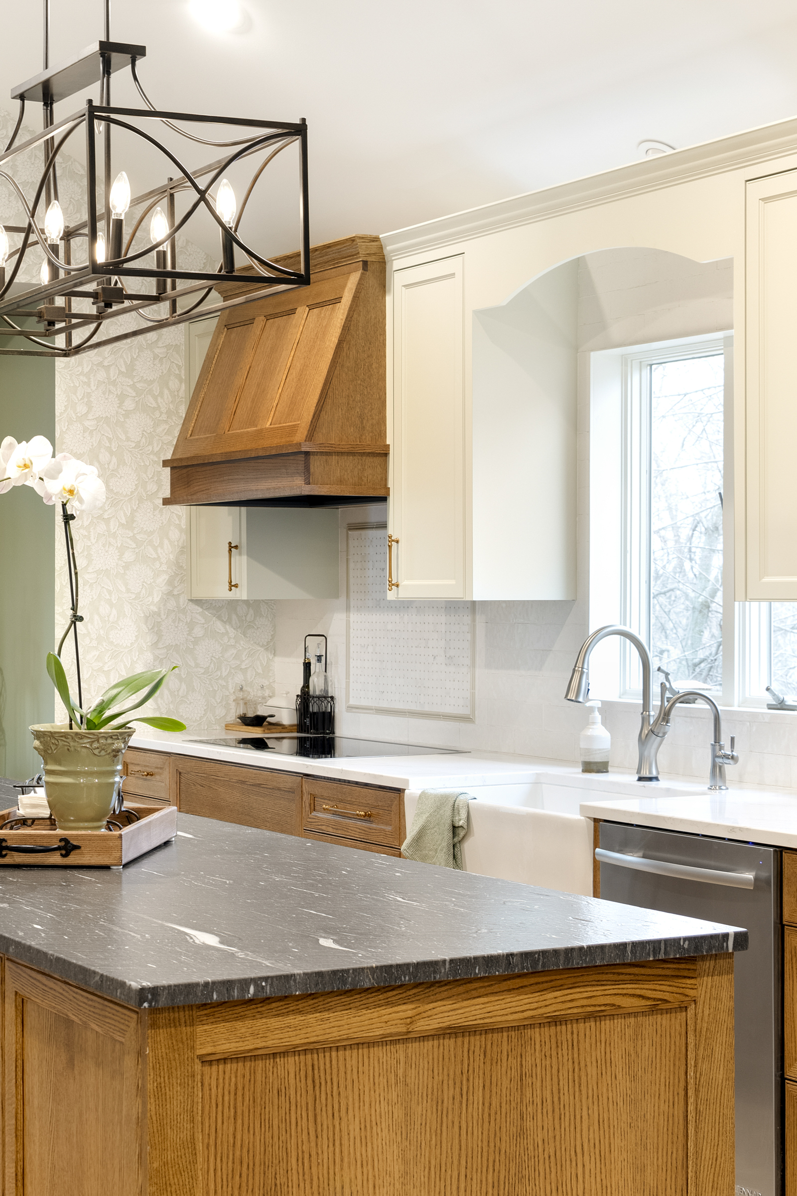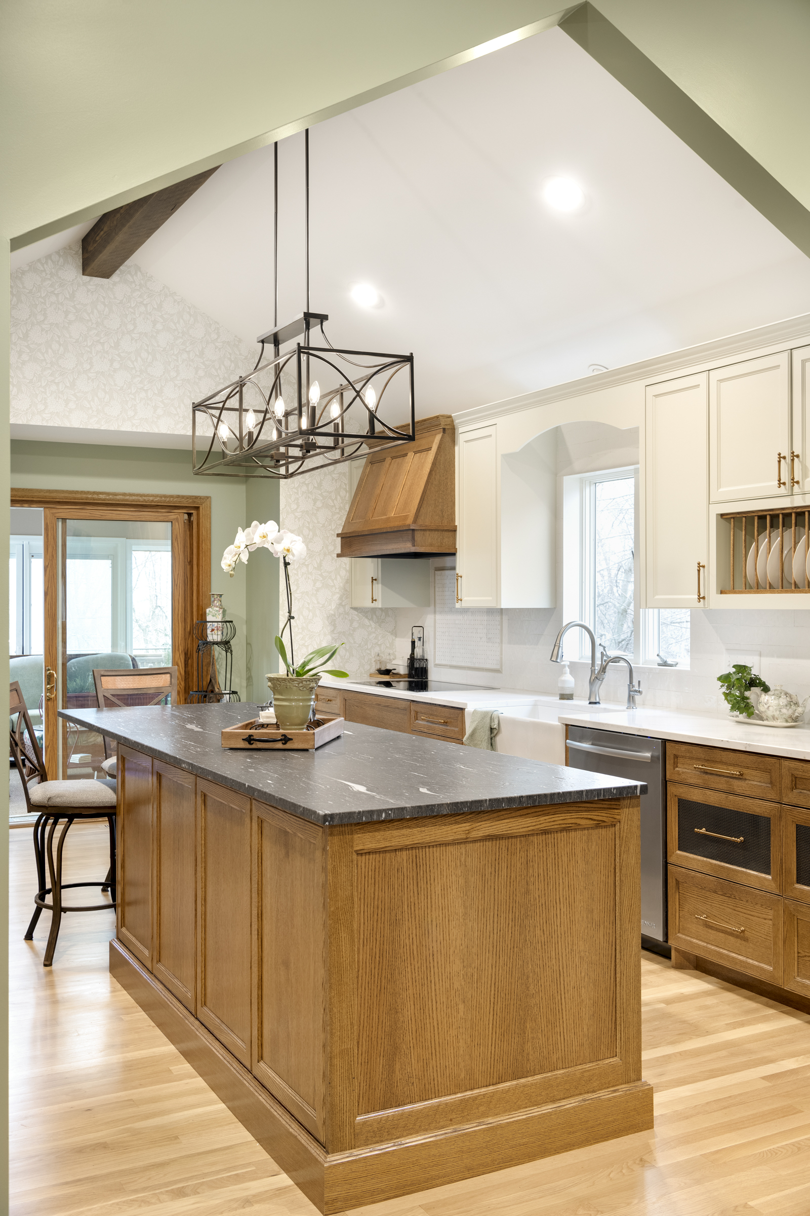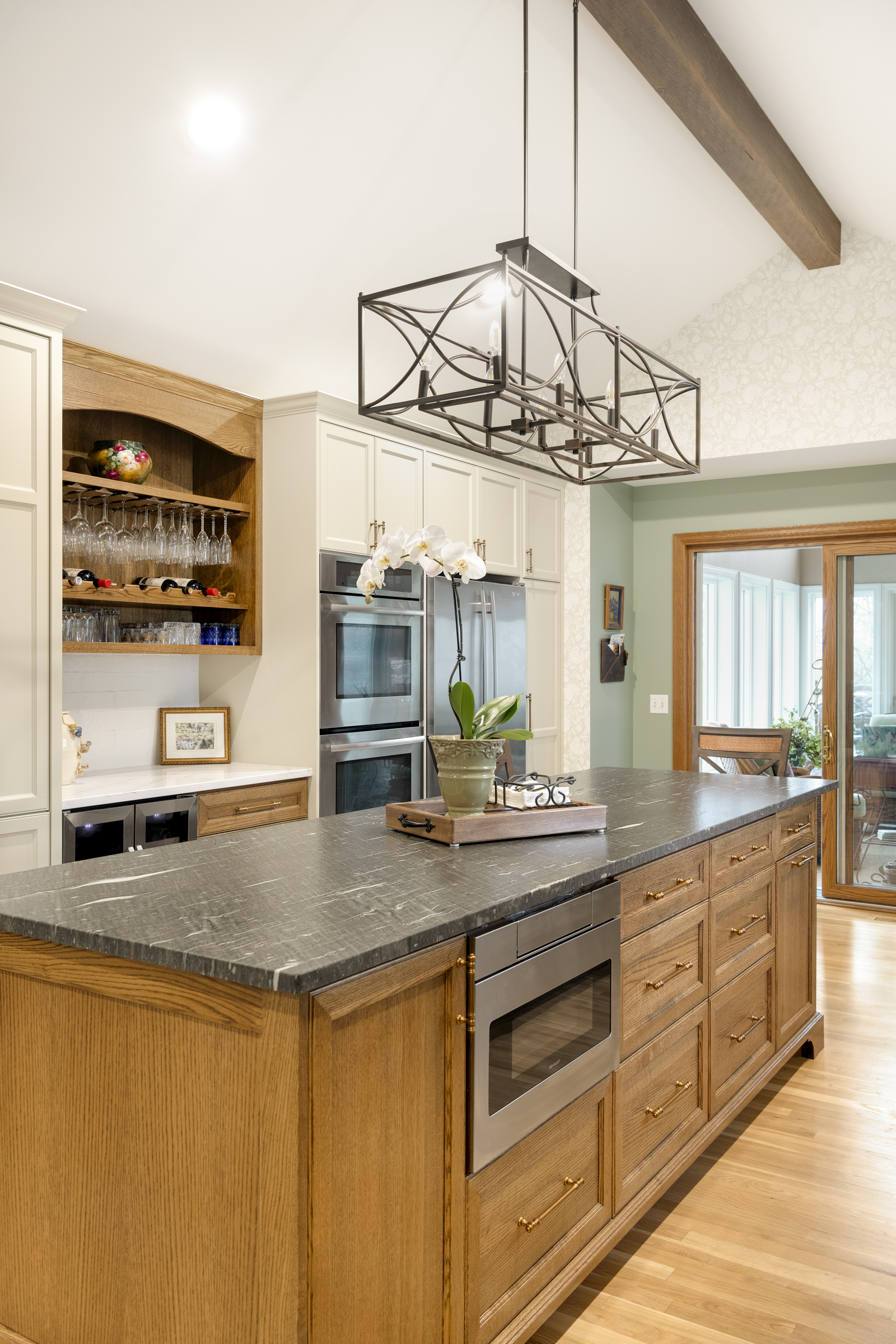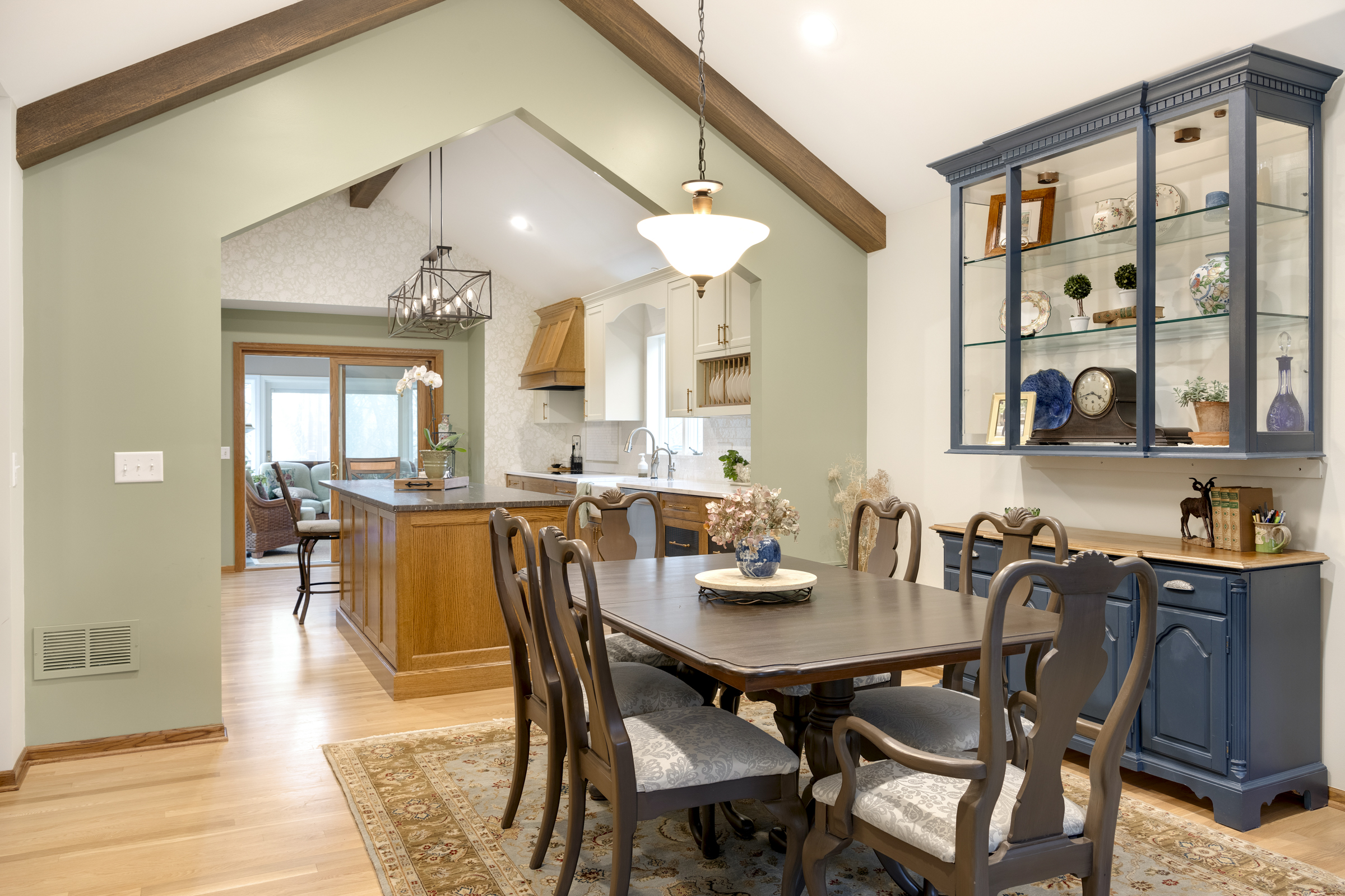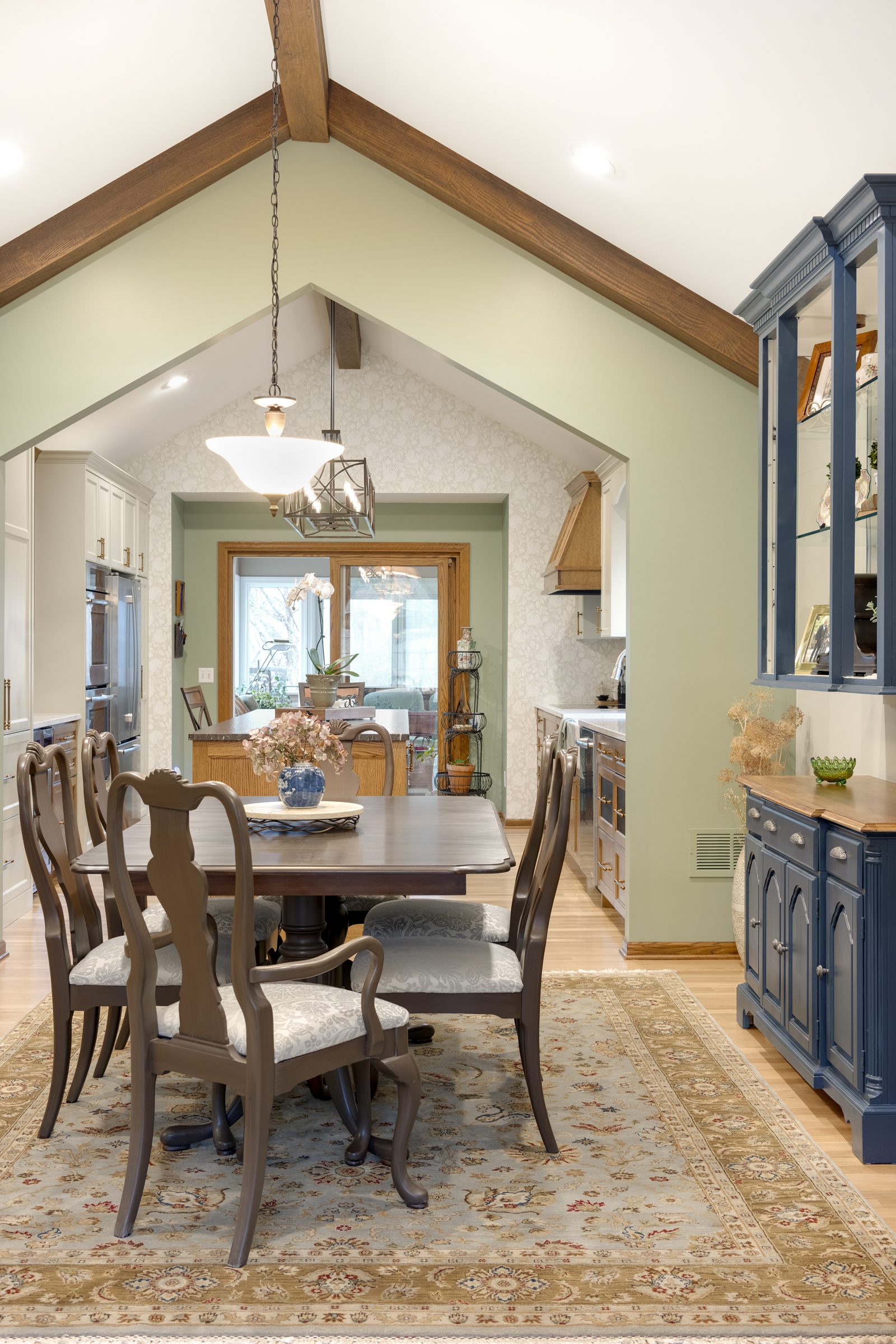 • Framing the wall between the existing dining area and redesigned kitchen maintains the architectural lines of the vaulted ceiling while delineating between the spaces