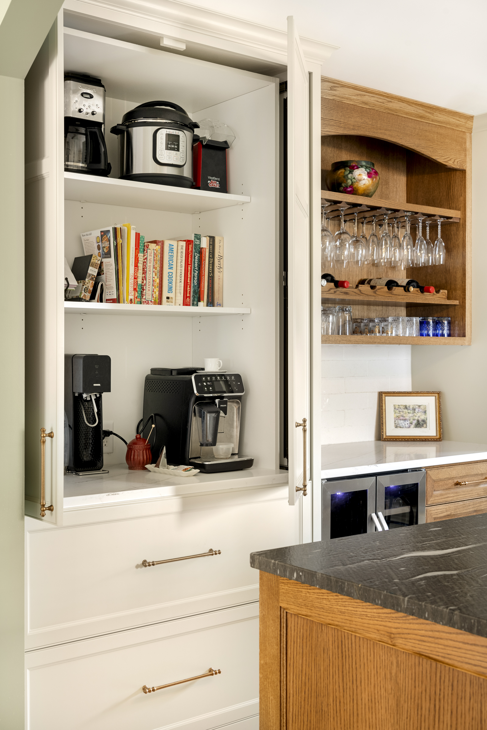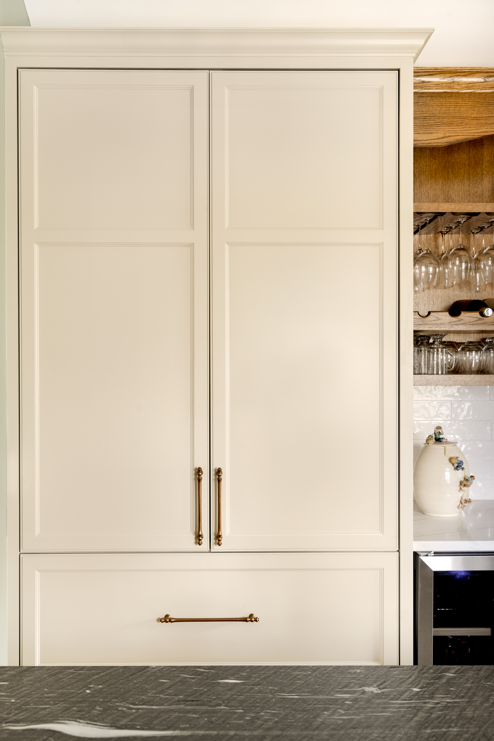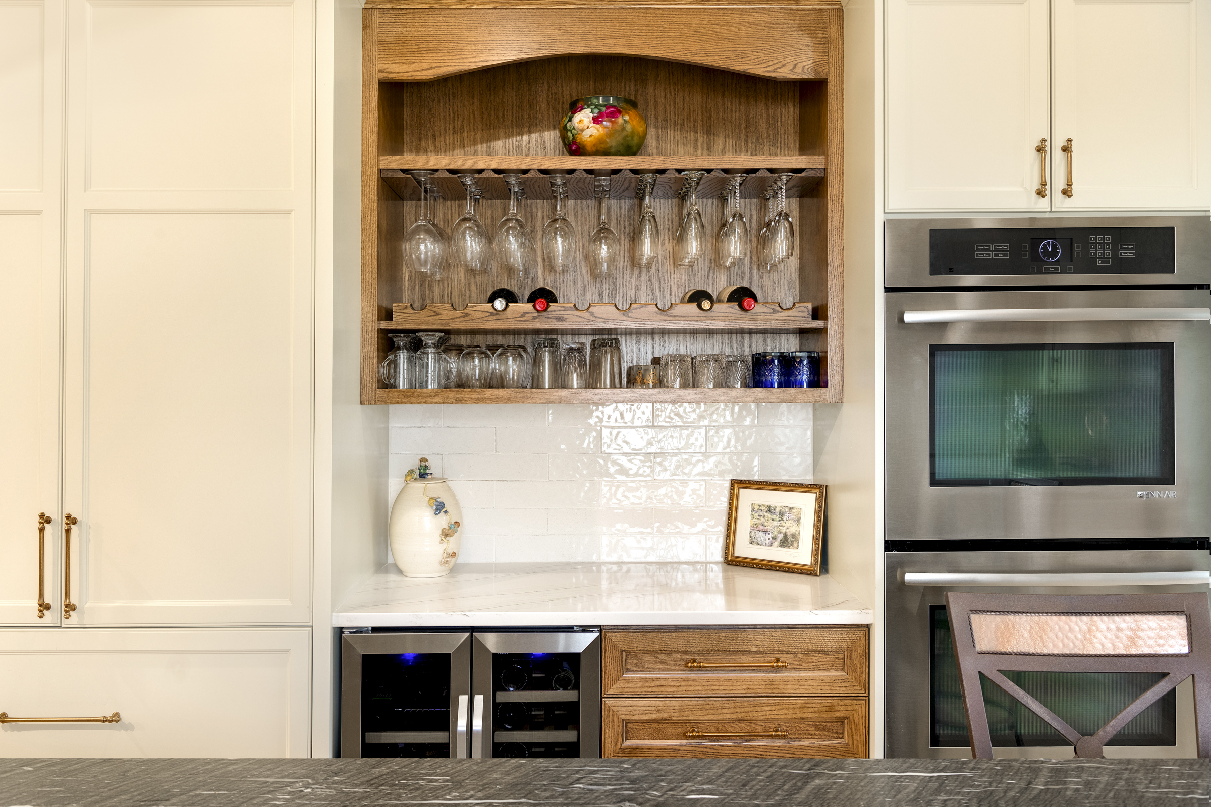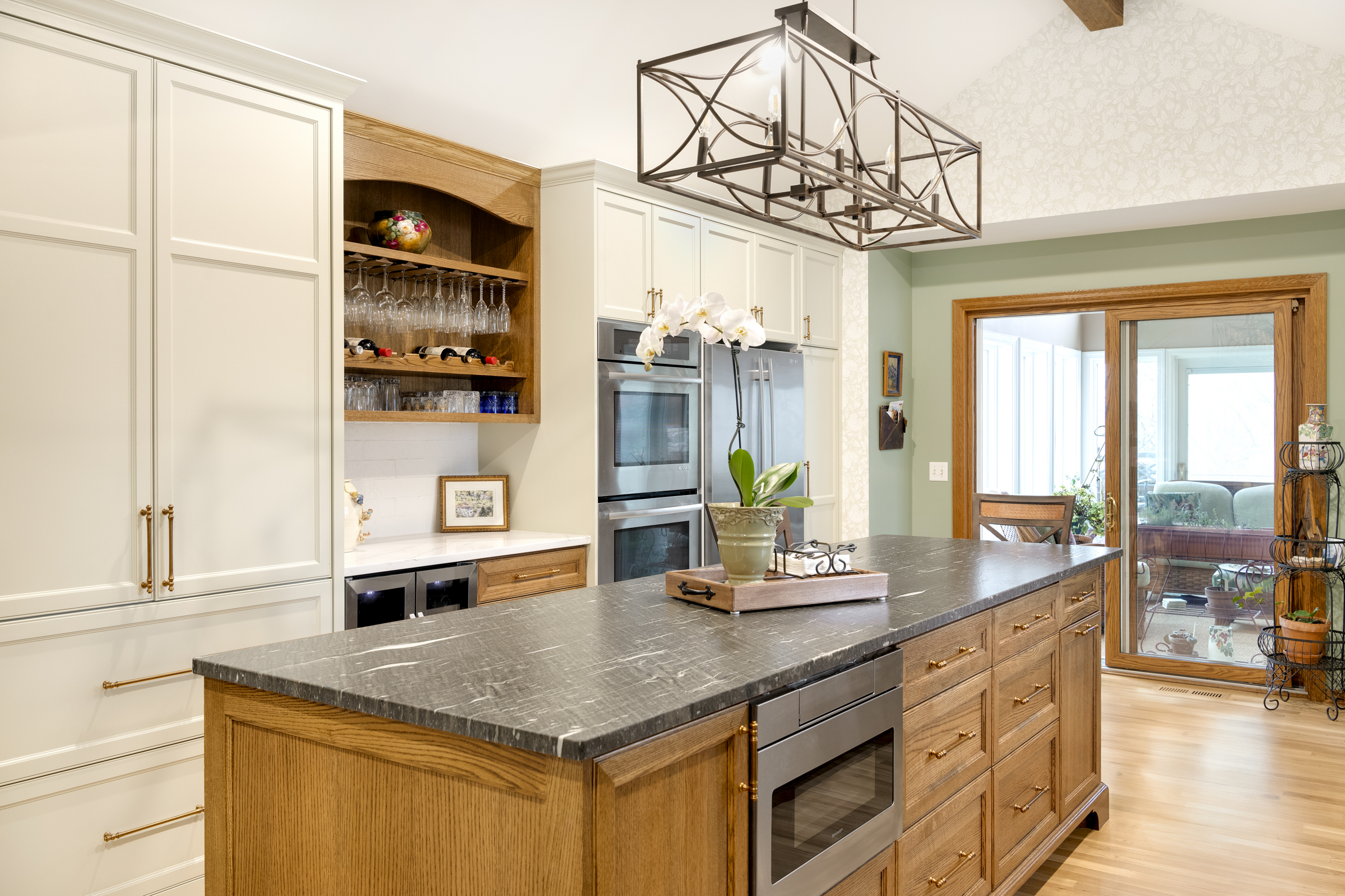 • Custom cabinetry using both stained and enameled finishes to create visual interest while creating more storage and conduciveness to entertaining
