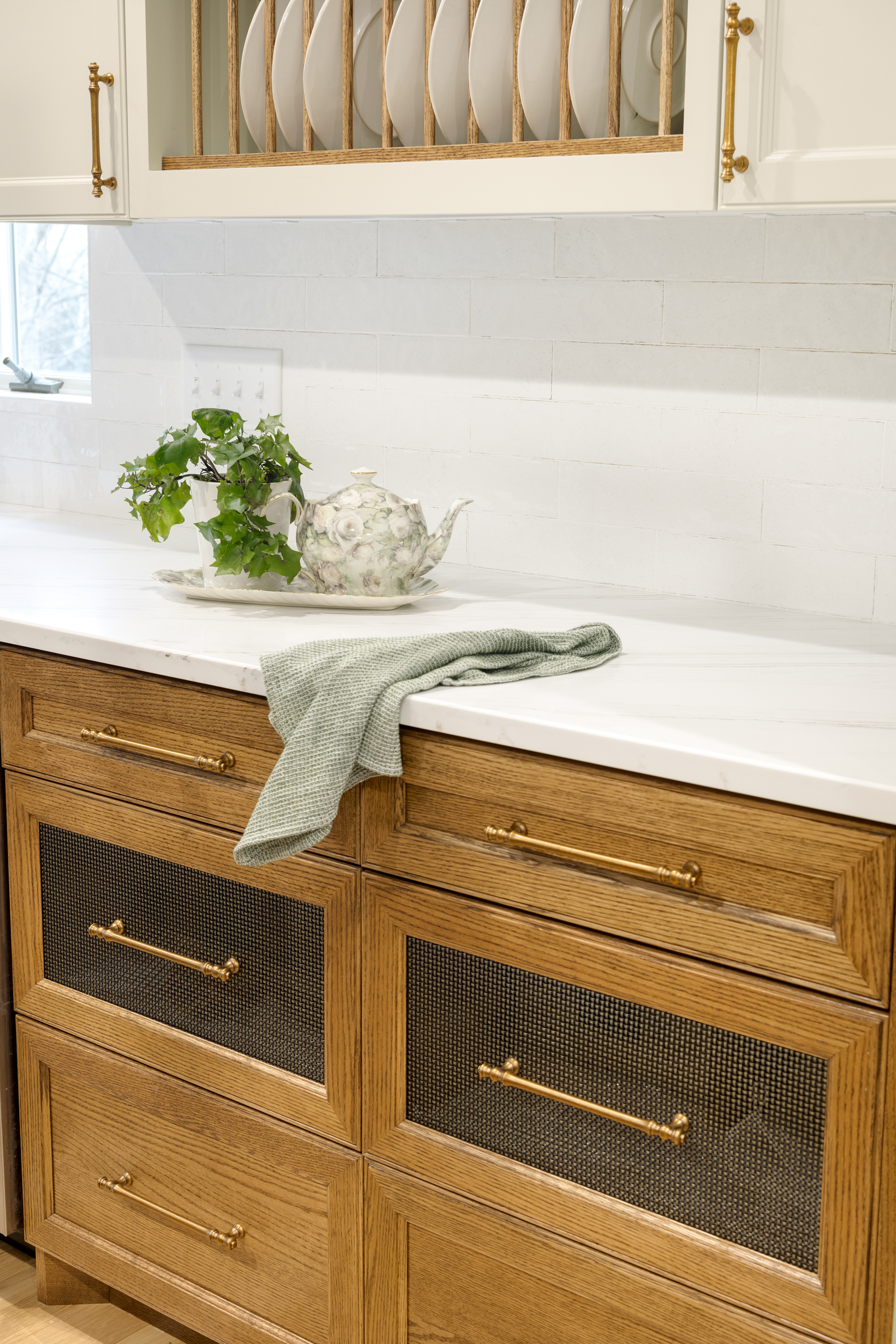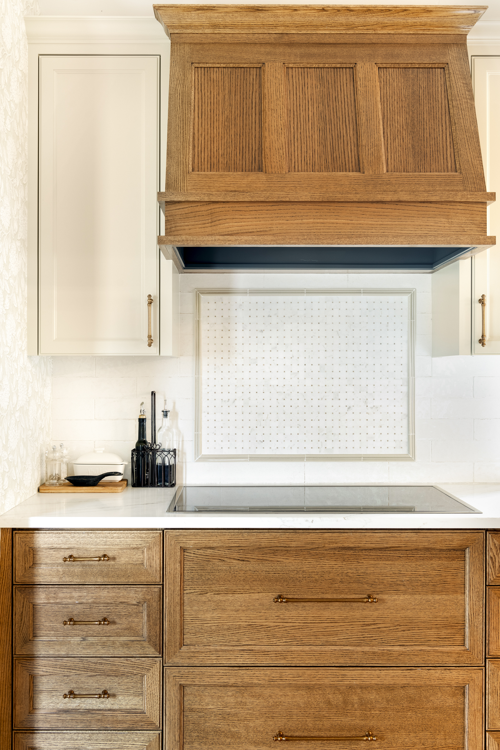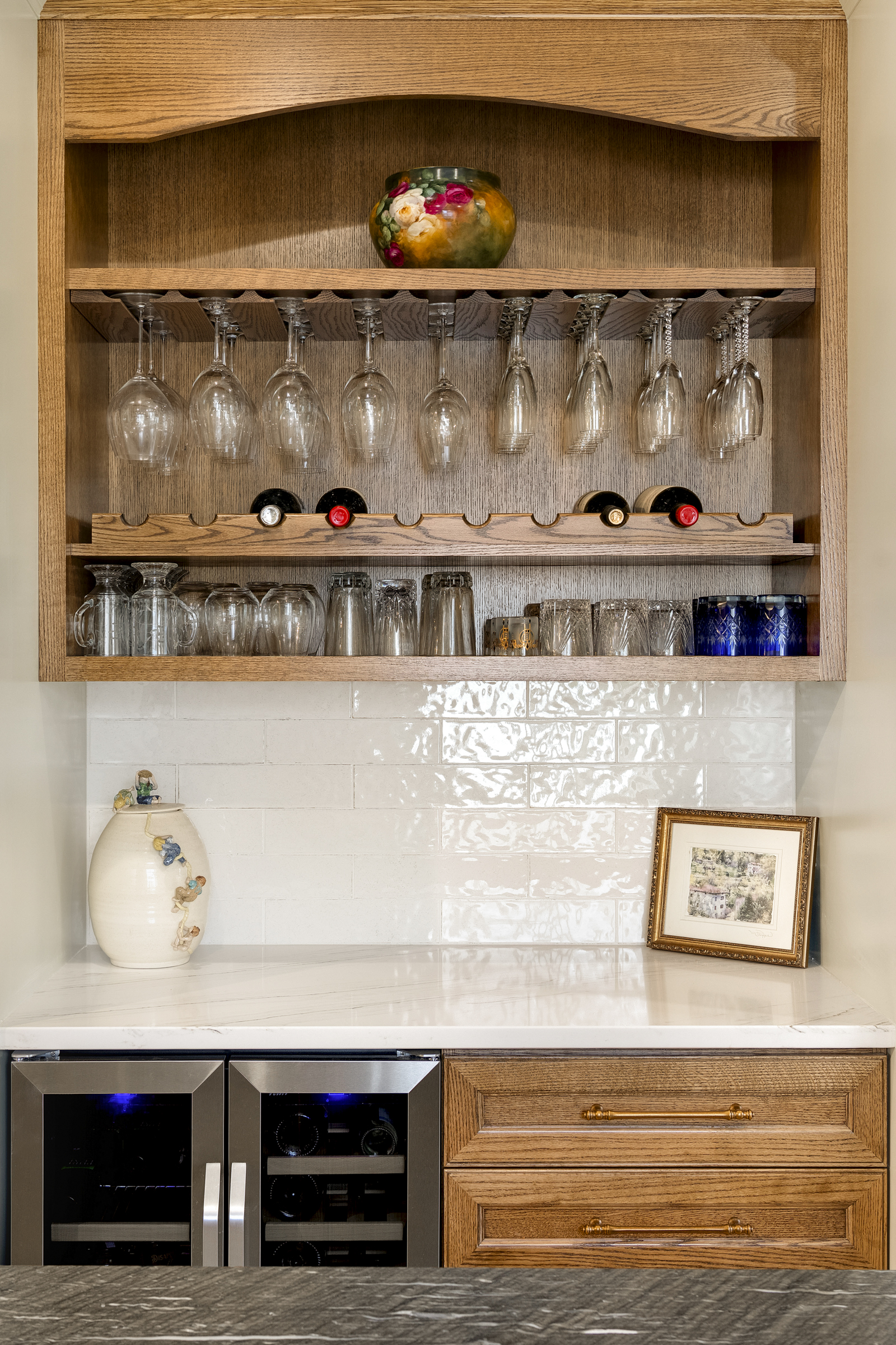 • Custom cabinetry using both stained and enameled finishes to create visual interest while creating more storage and conduciveness to entertaining