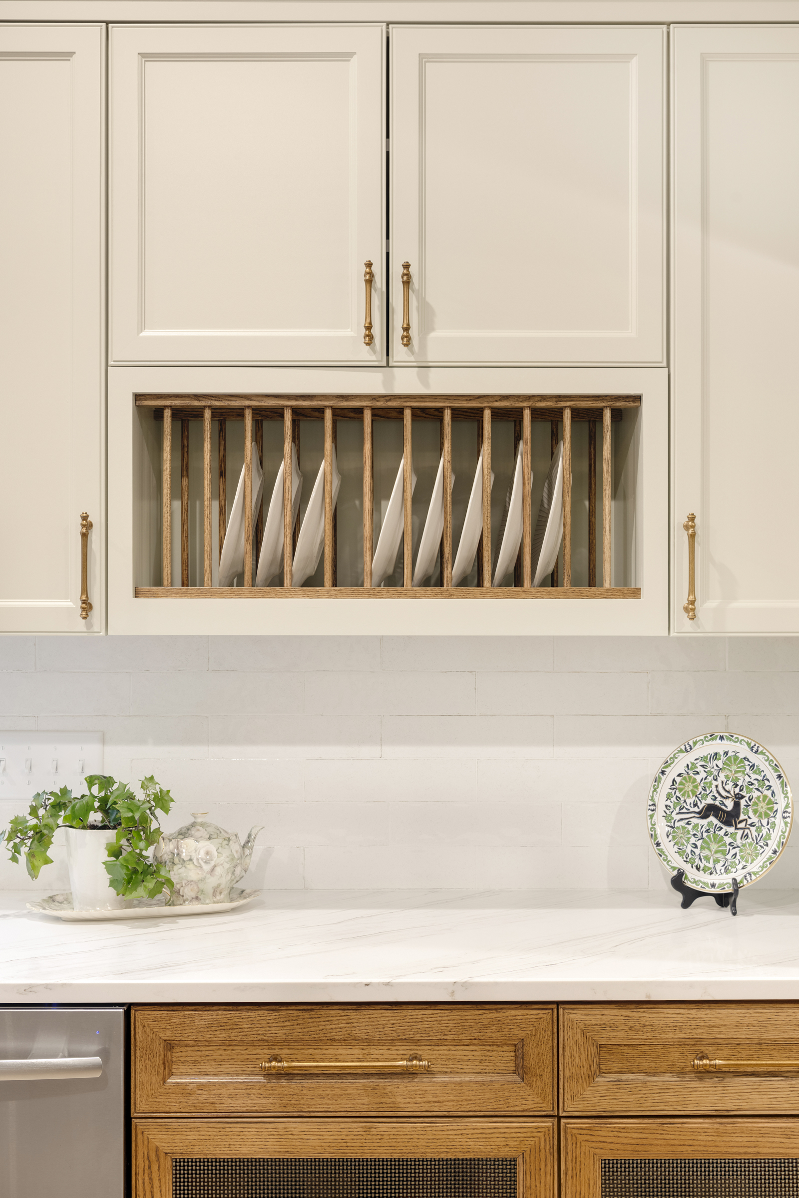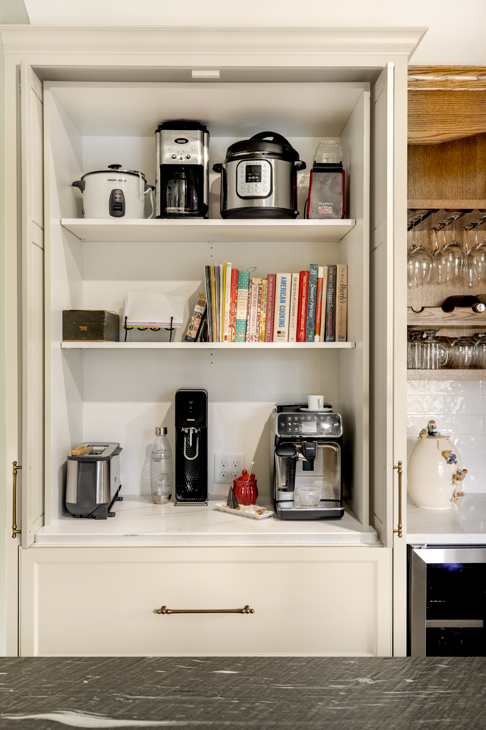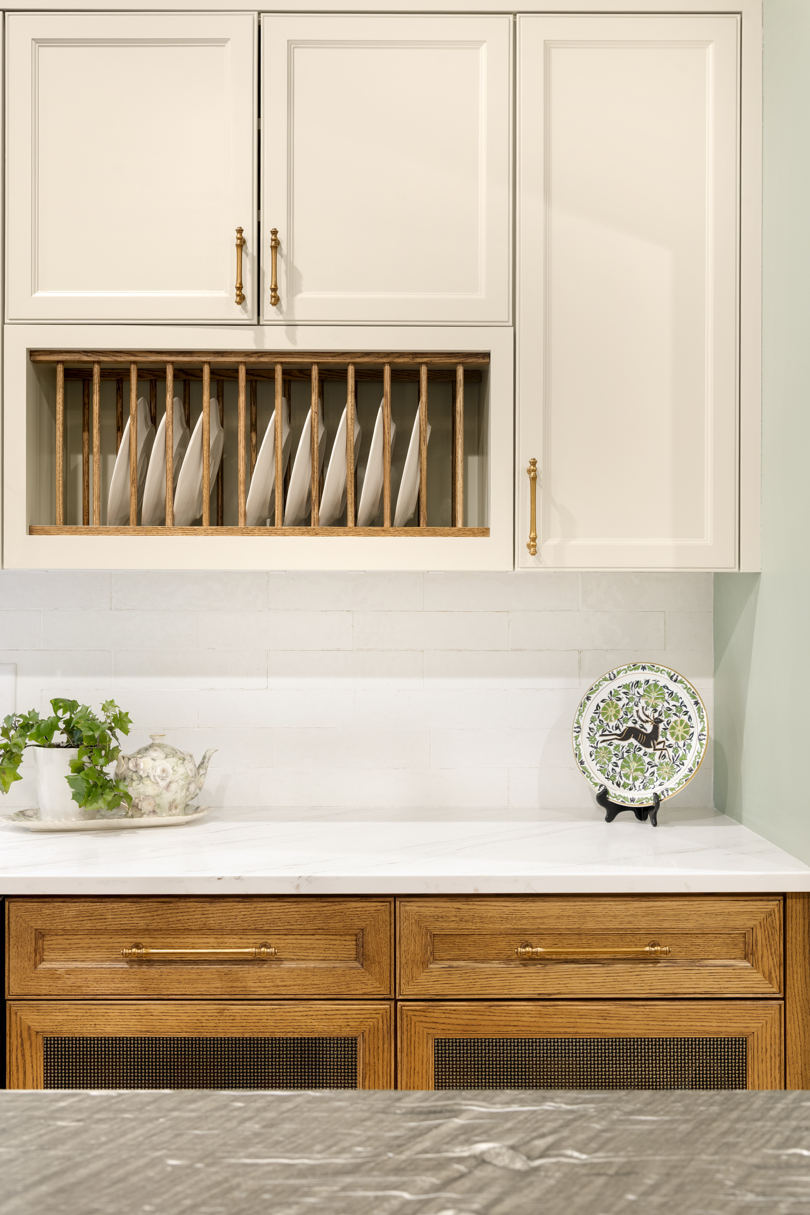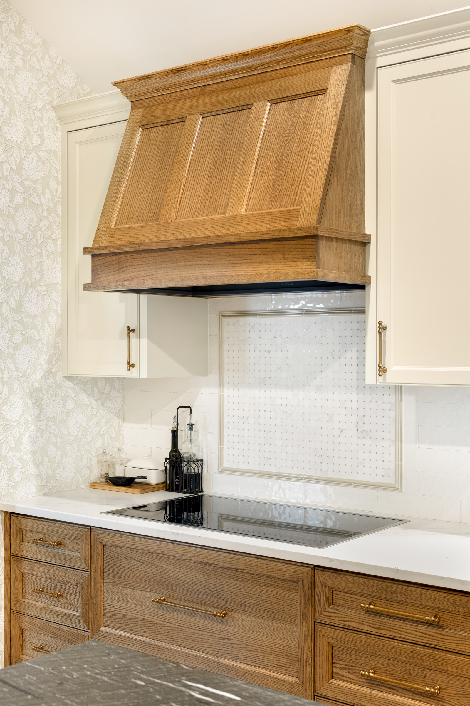 • Custom cabinetry using both stained and enameled finishes to create visual interest while creating more storage and conduciveness to entertaining