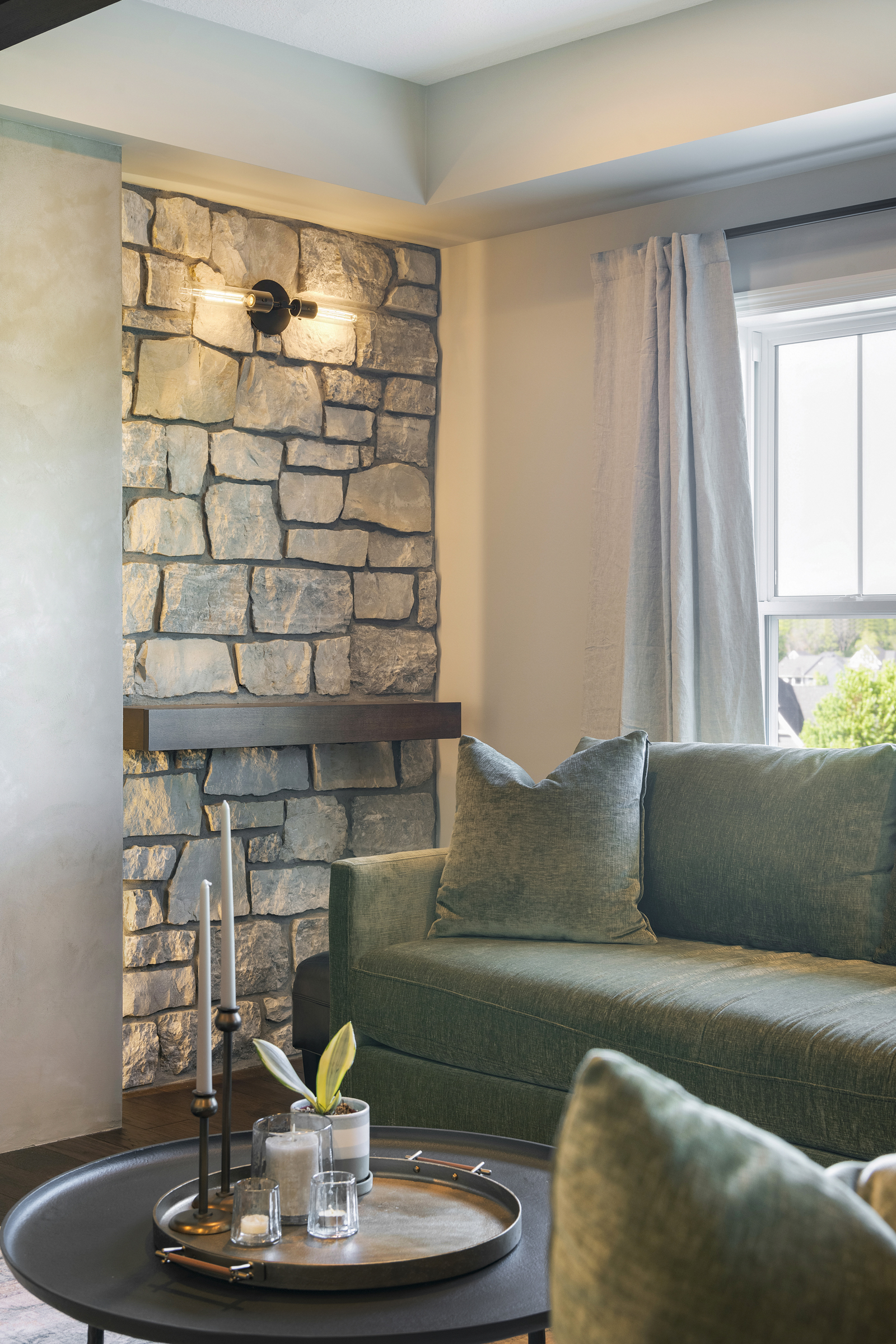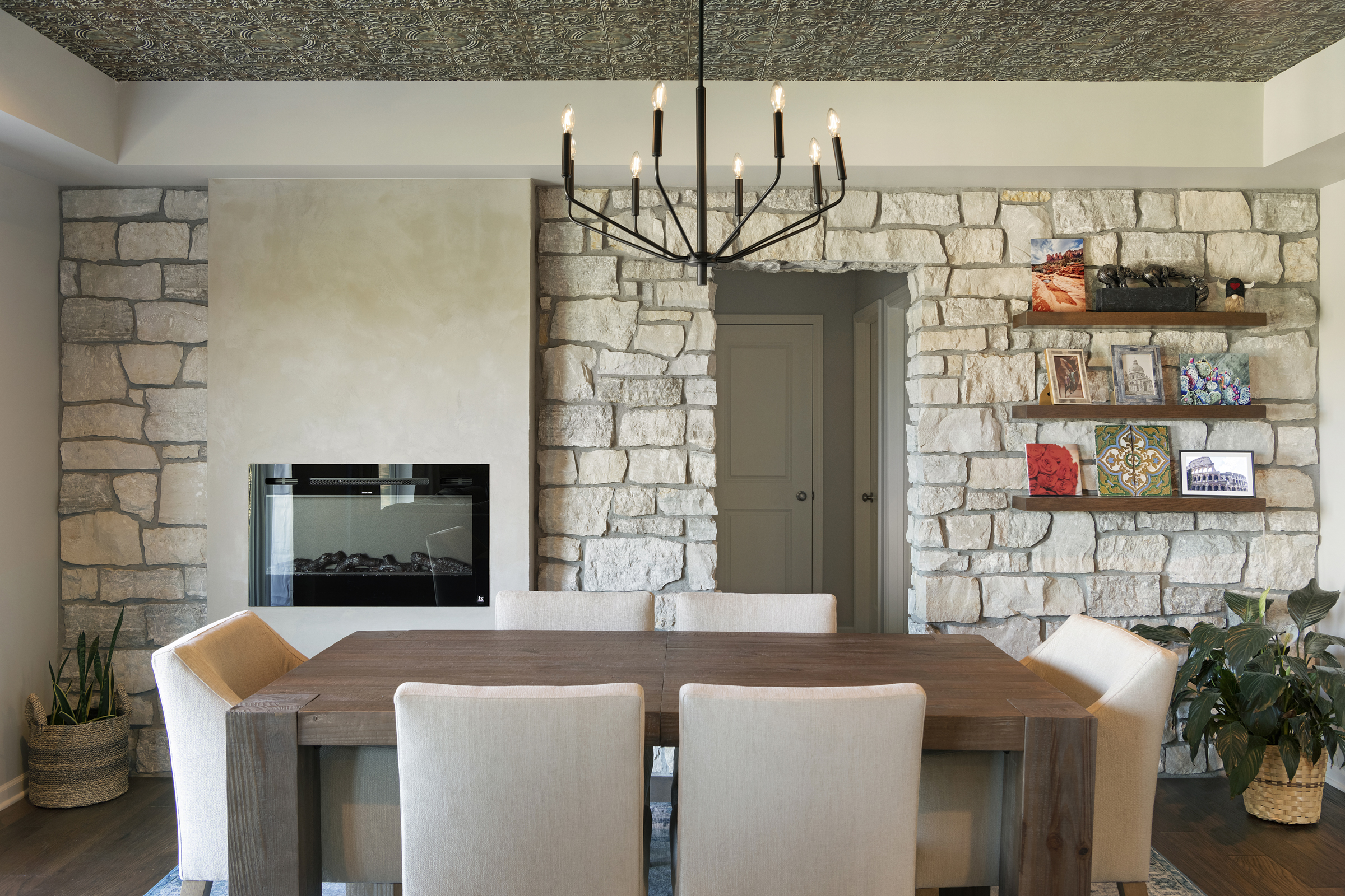 • Hand crafted Venetian plaster wall accents and stone installations create both visual and physical texture throughout the space