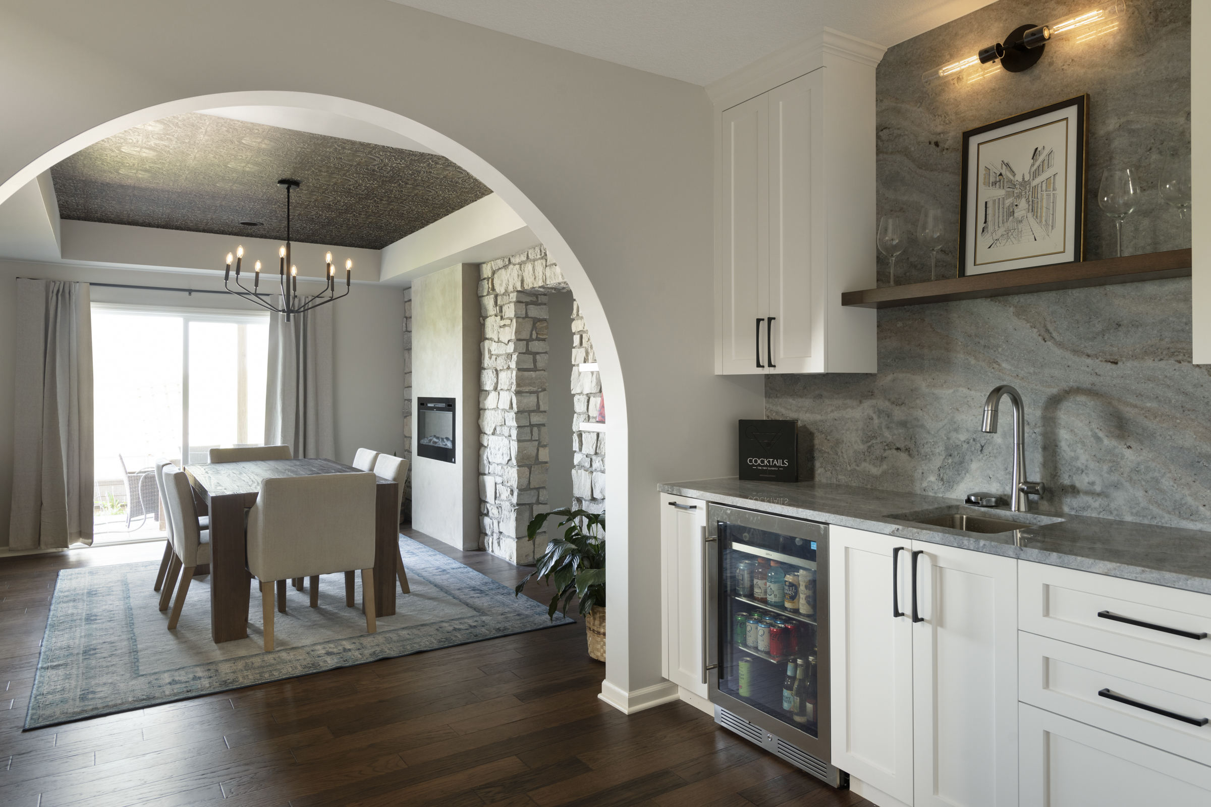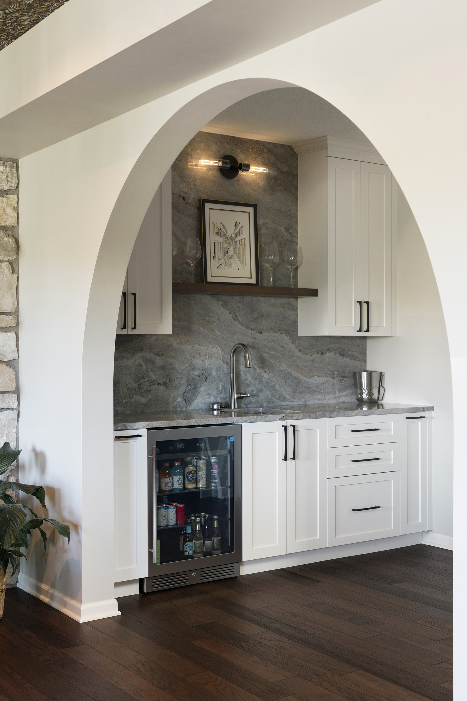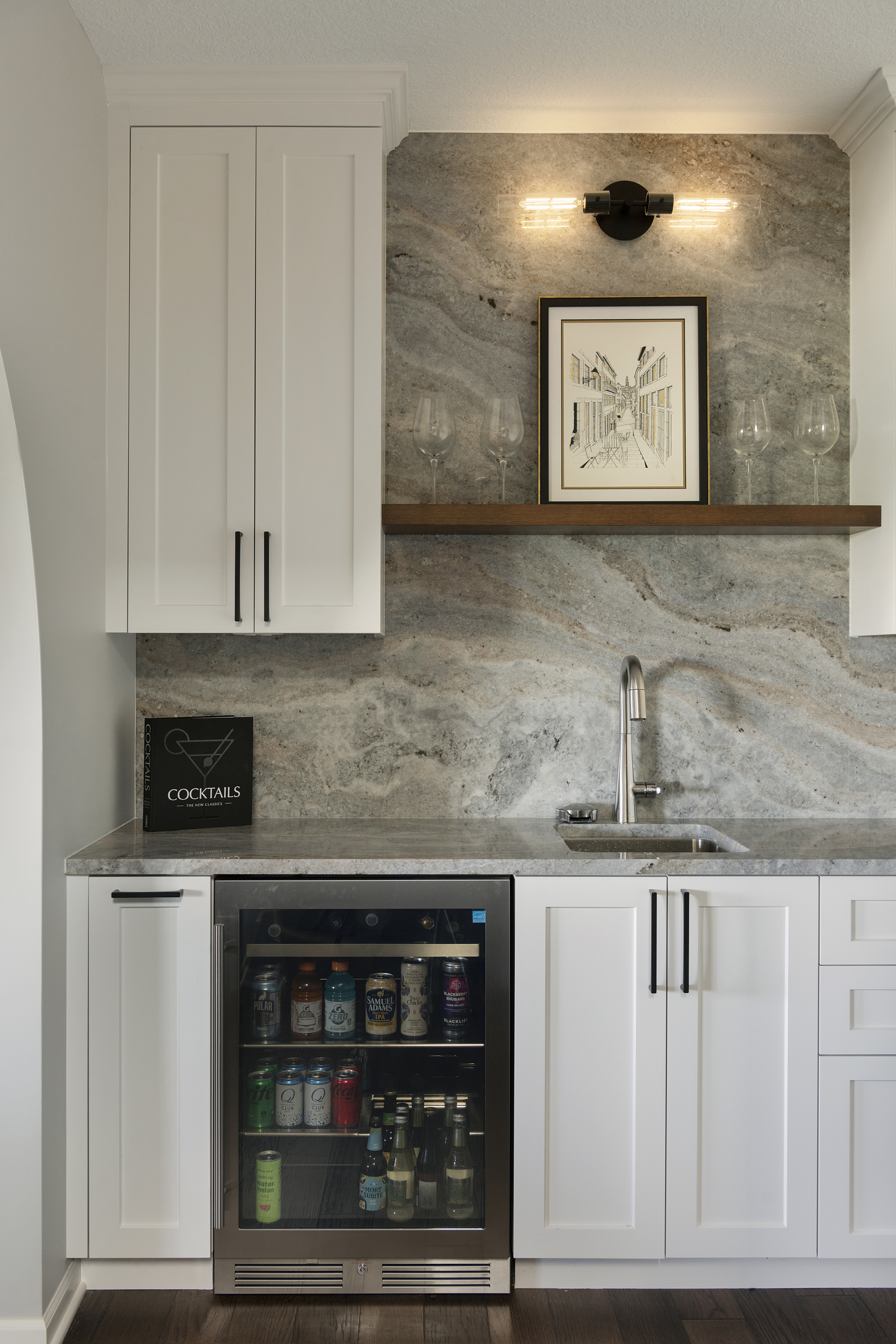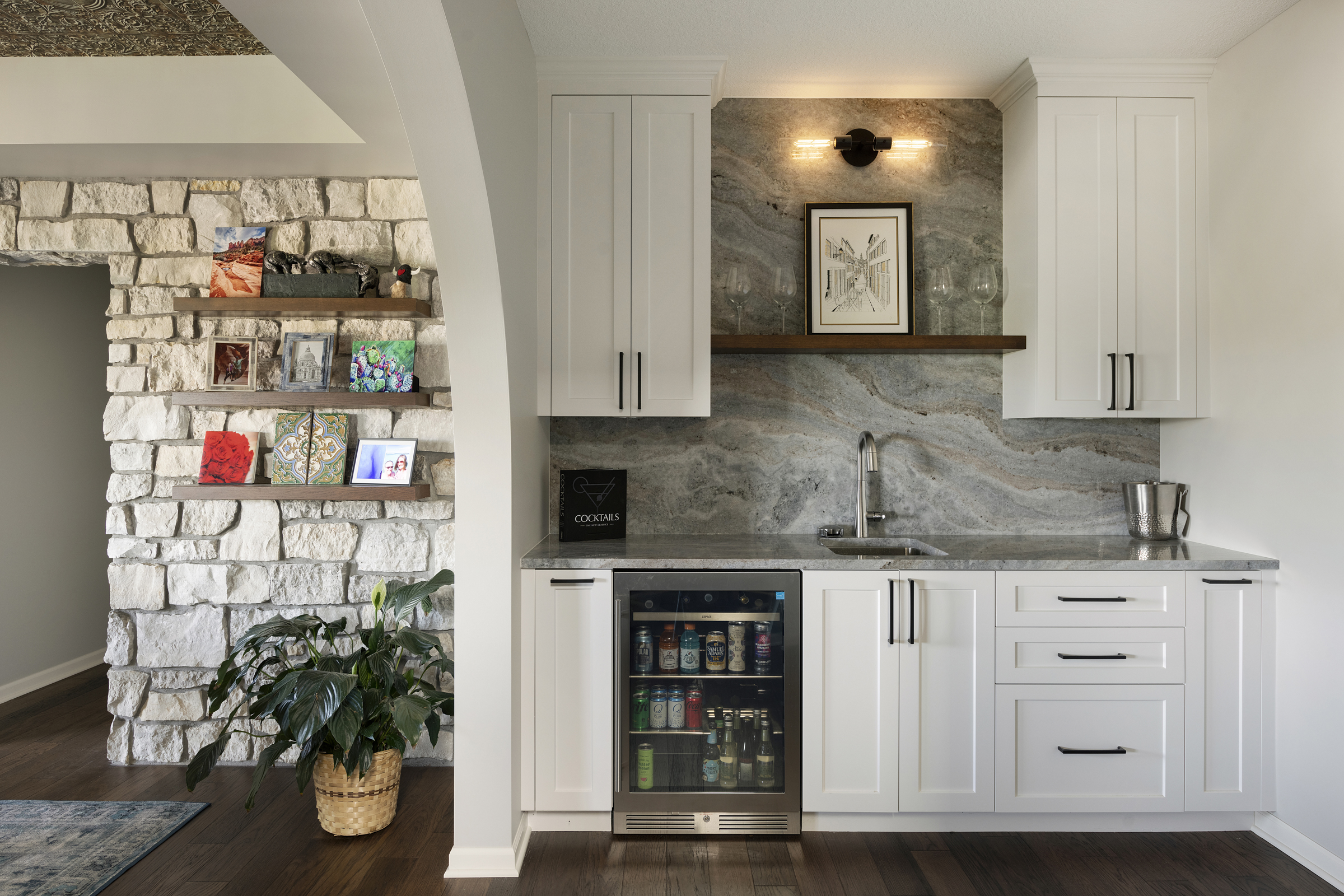 • Natural stone countertop waterfalling from full height backsplash to create a functional work of art behind the bar countertop and cabinetry