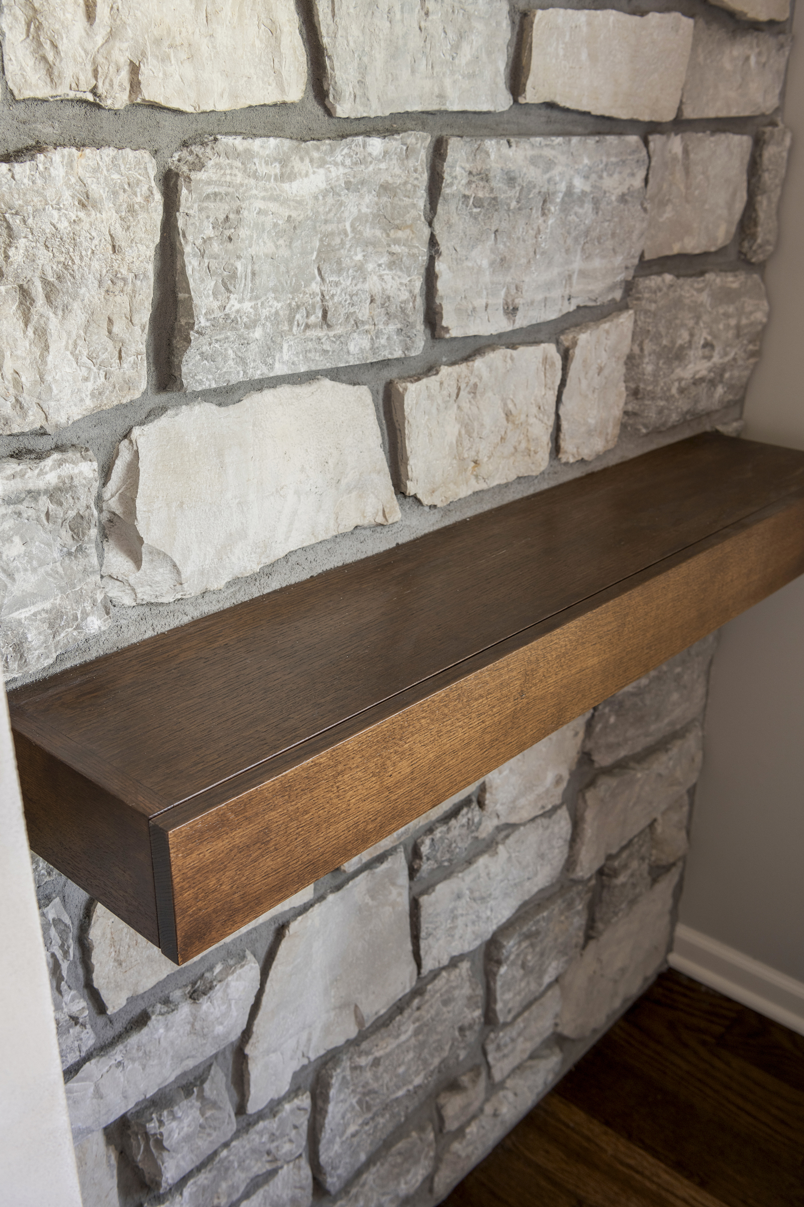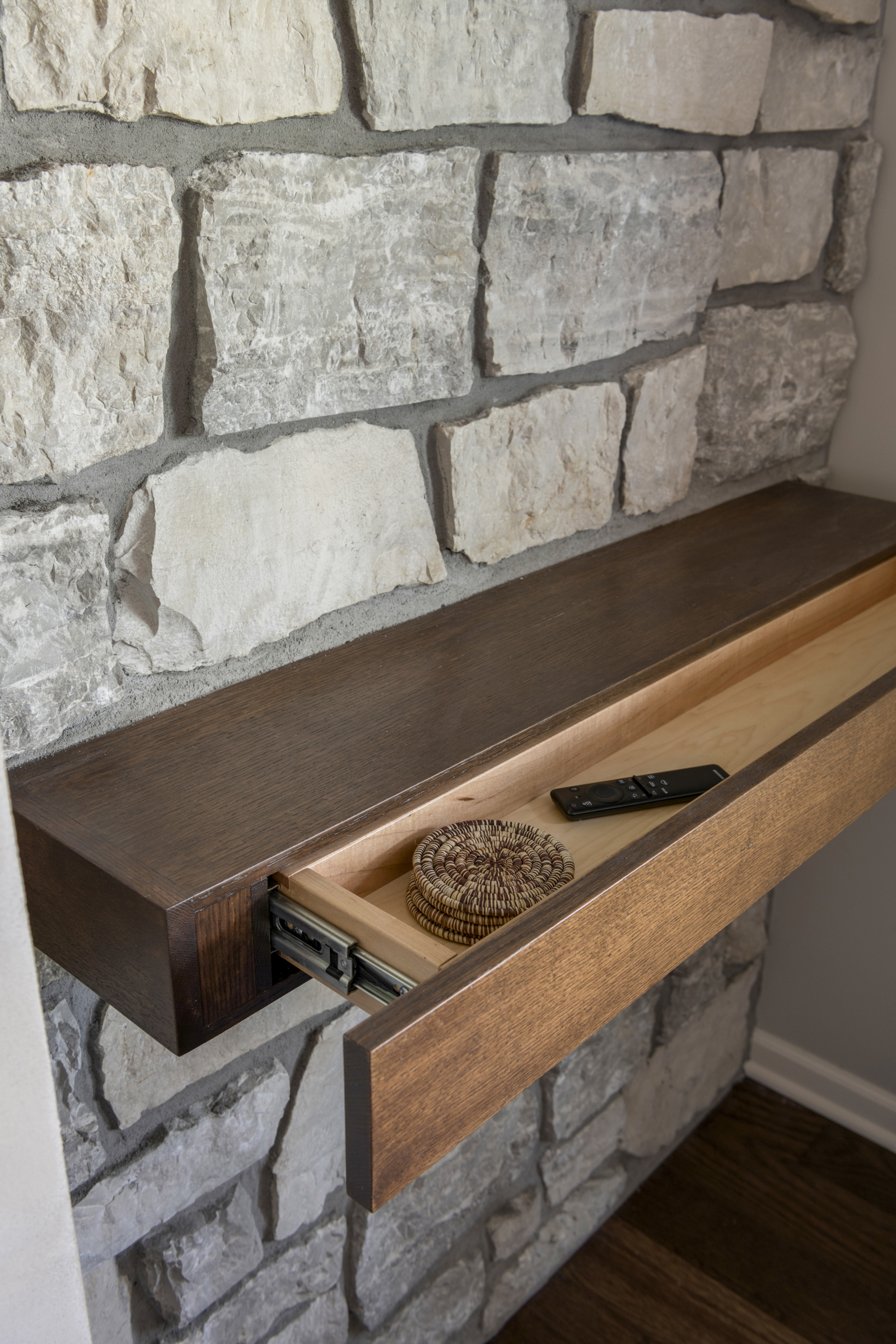 • Custom cabinetry featuring cleated floating shelves with hidden cord management and remote storage