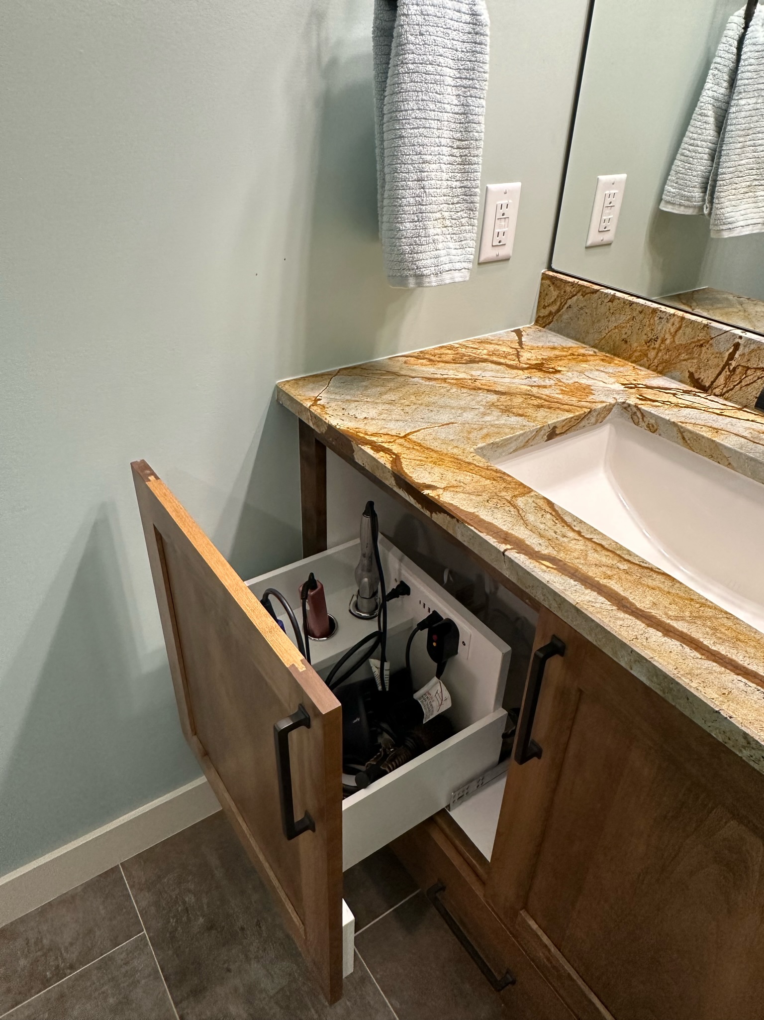• Custom cabinetry with recessed towers, complete with interior outlets, in both bathrooms provide additional storage for small vanity items without sacrificing valuable countertop space