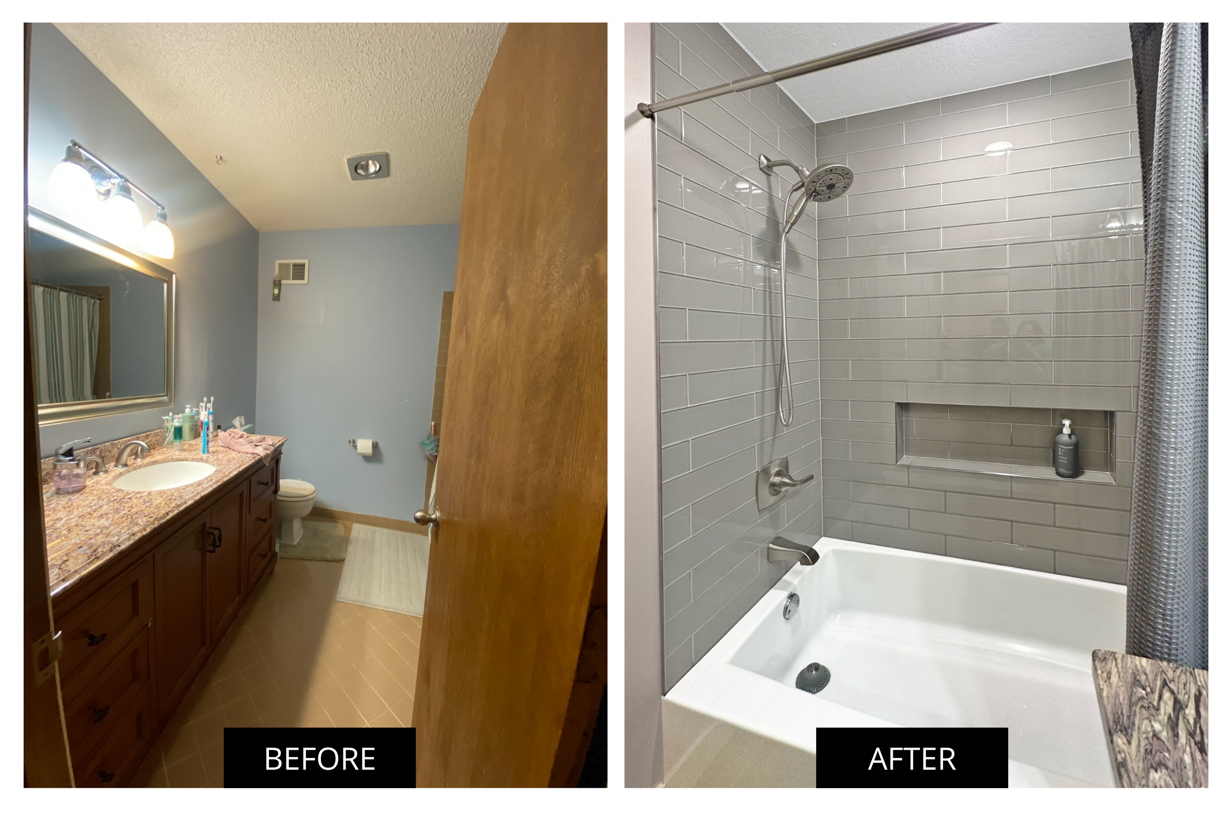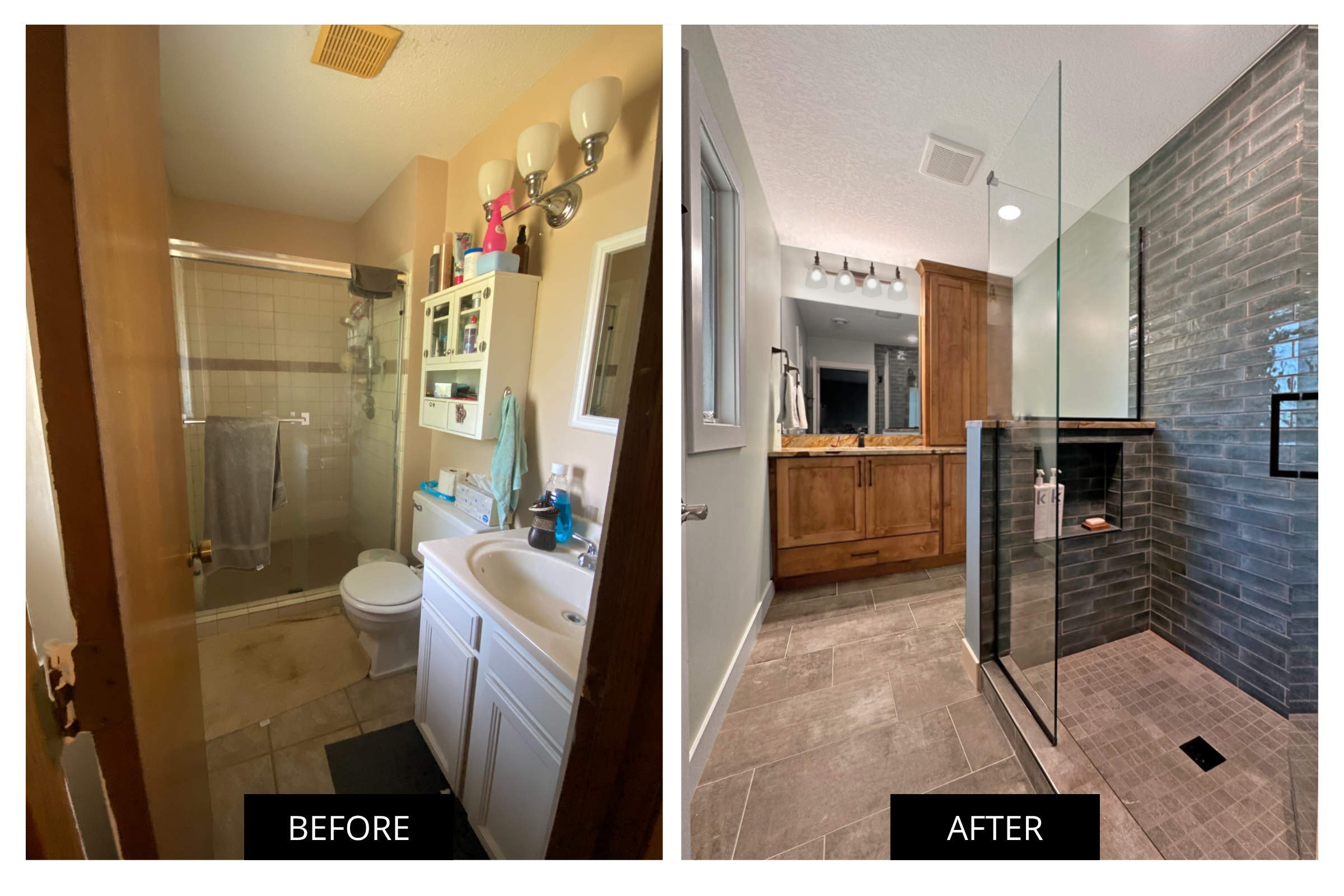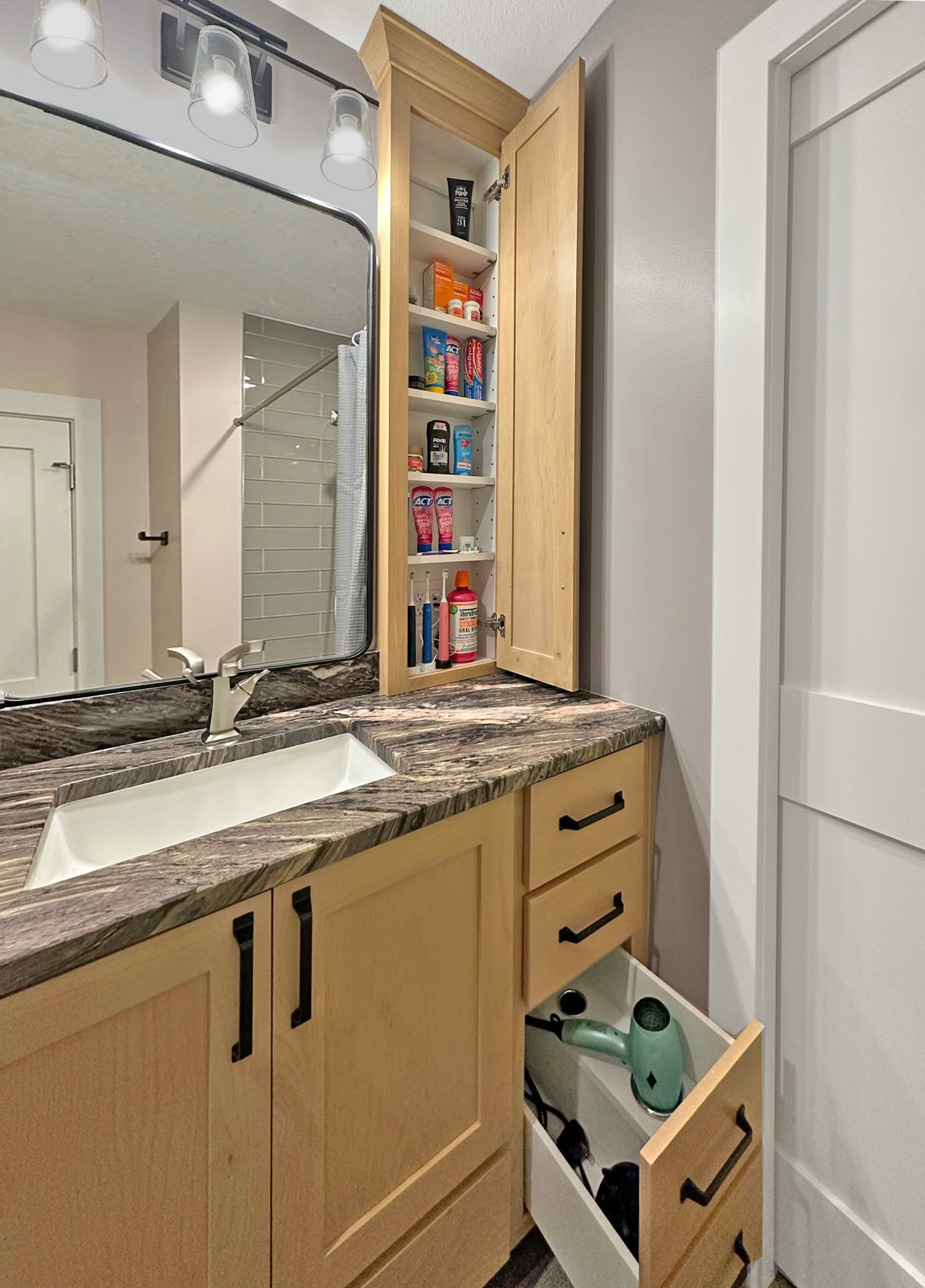 • Relocating the bathtub improved overall layout efficiency and optimal space utilization by creating a built-in hall linen for additional storage