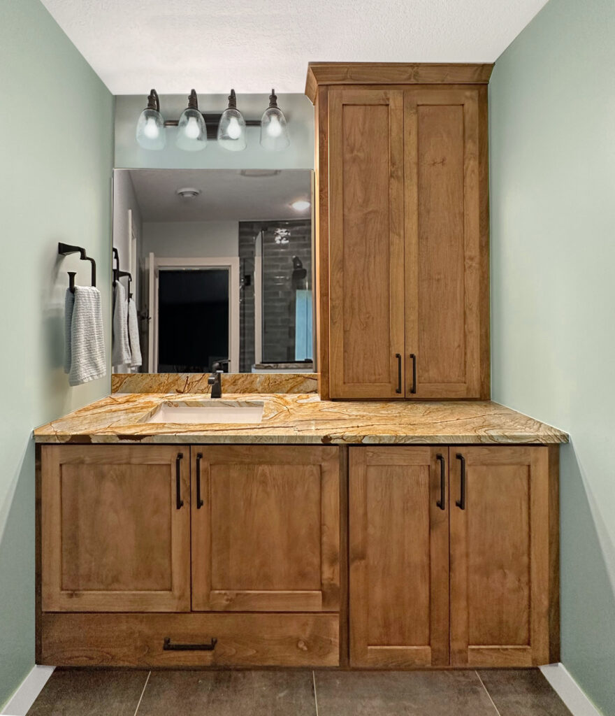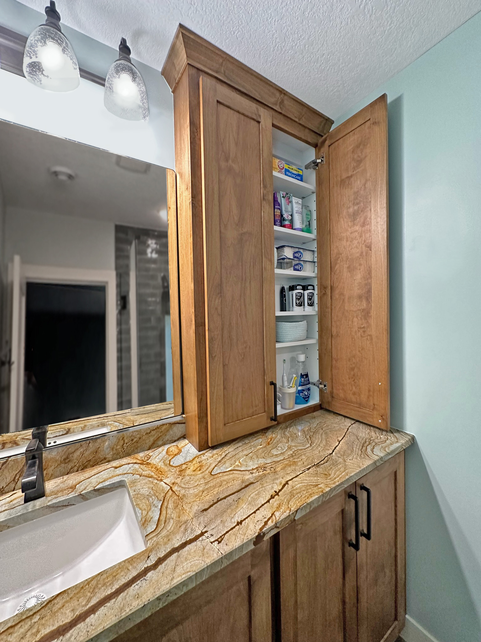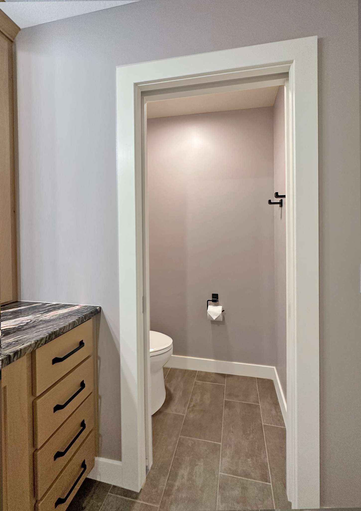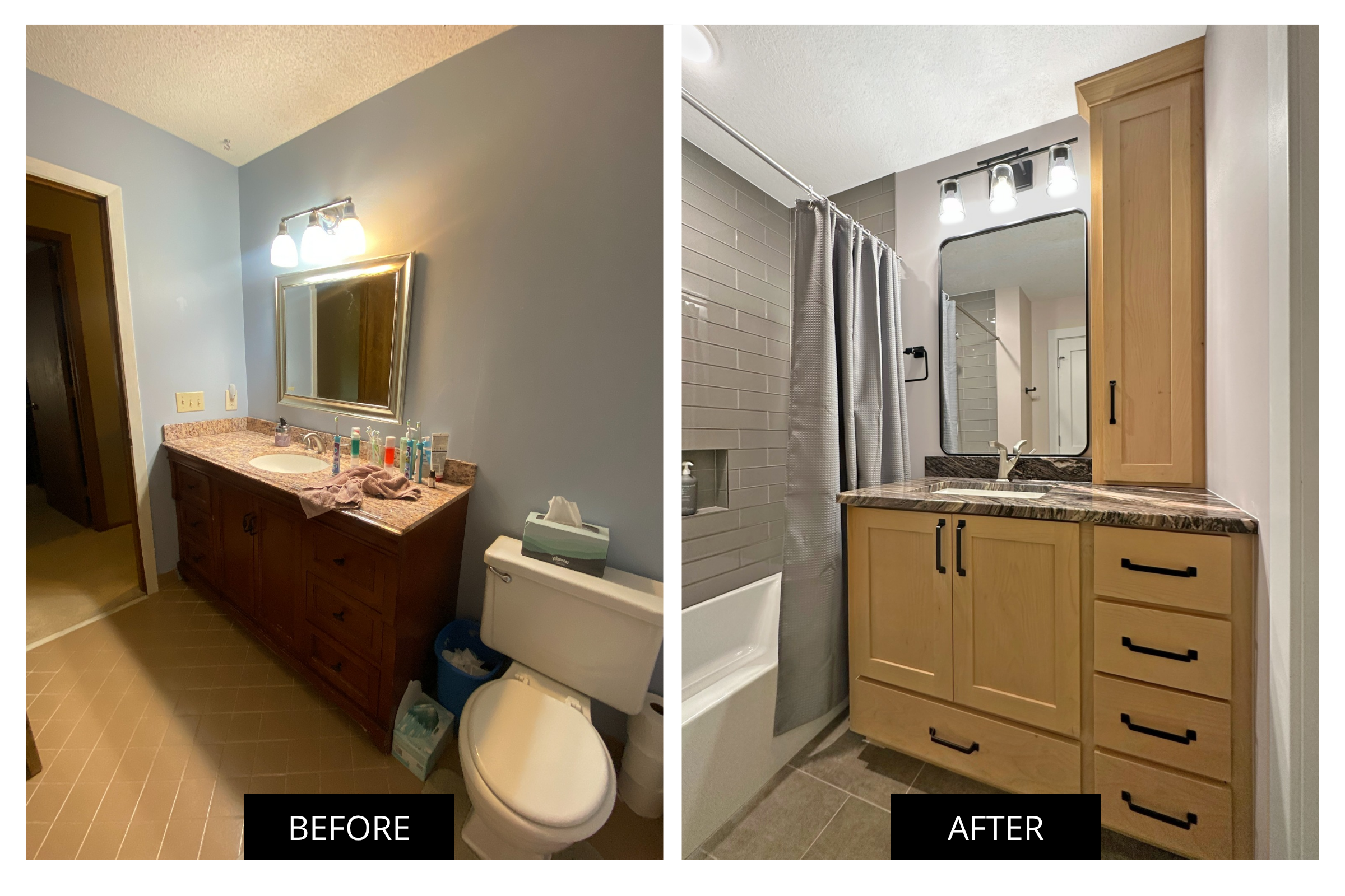 • Relocating the bathtub improved overall layout efficiency and optimal space utilization by creating a built-in hall linen for additional storage